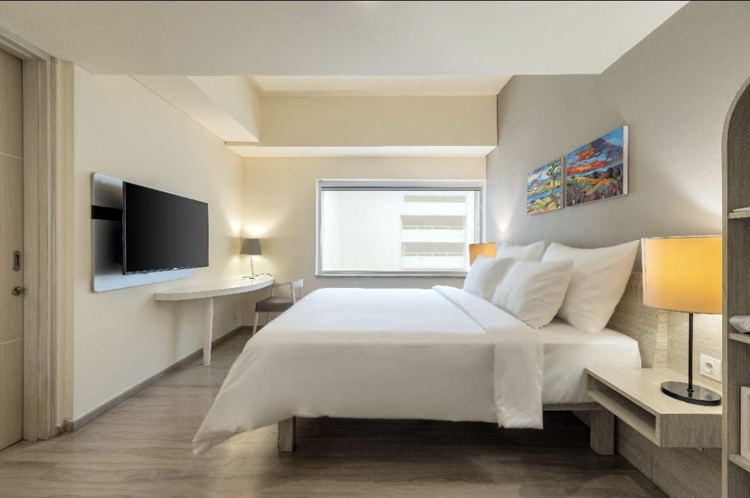 Fasilitas tambahan seperti kolam renang, EATSPACE (restoran hotel), dan Lounge Bar semakin melengkapi pengalaman menginap yang harmonis.