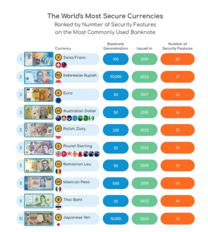 BestBrokers menganalisis 39 mata uang paling sering diperdagangkan pada tahun 2022, menilai uang kertas berdasarkan jumlah fitur anti-pemalsuan.